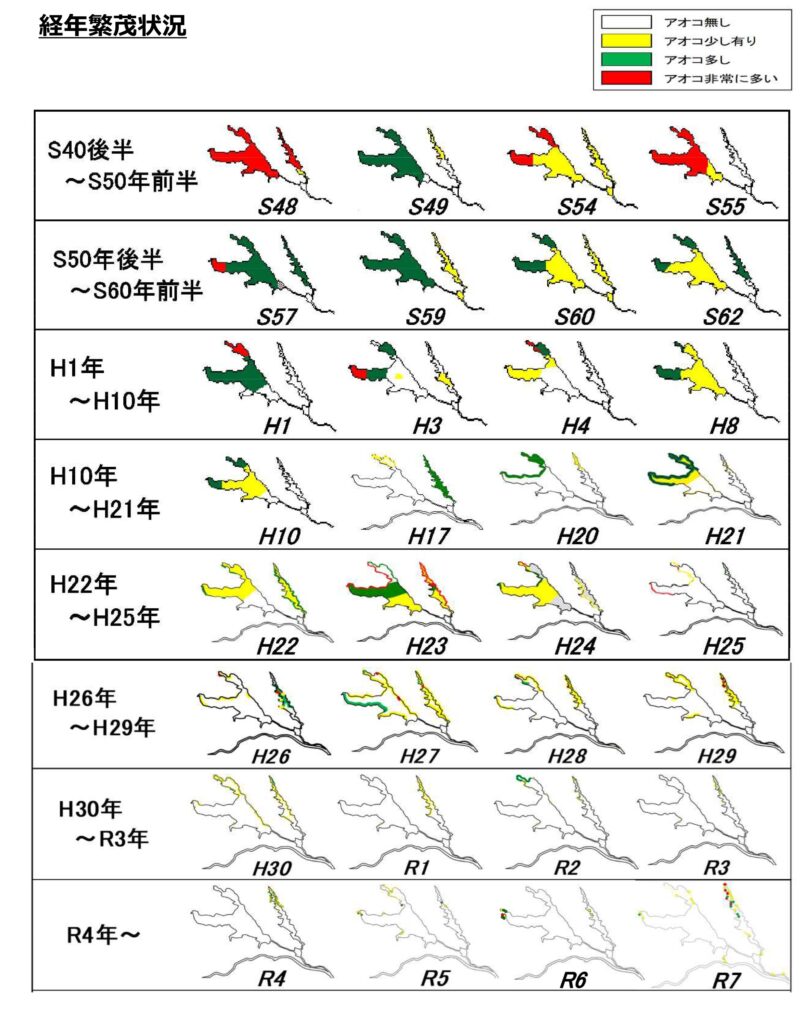 データによると2025年は2017年以来8年ぶりに北浦の一部に『アオコ非常に多い』エリアが観測されています。