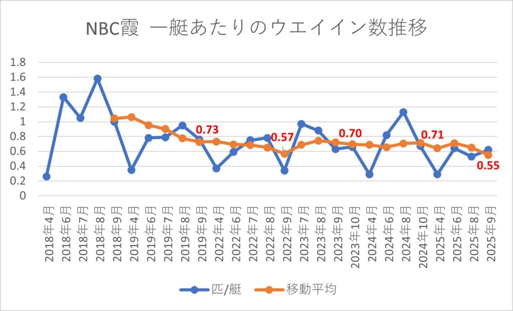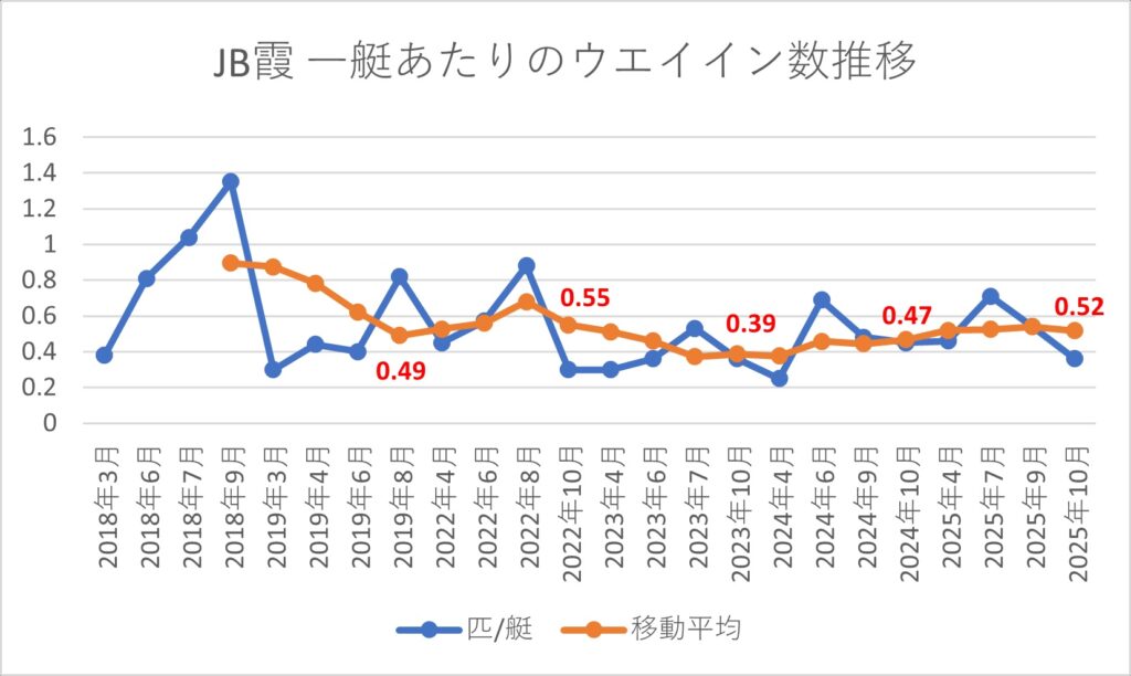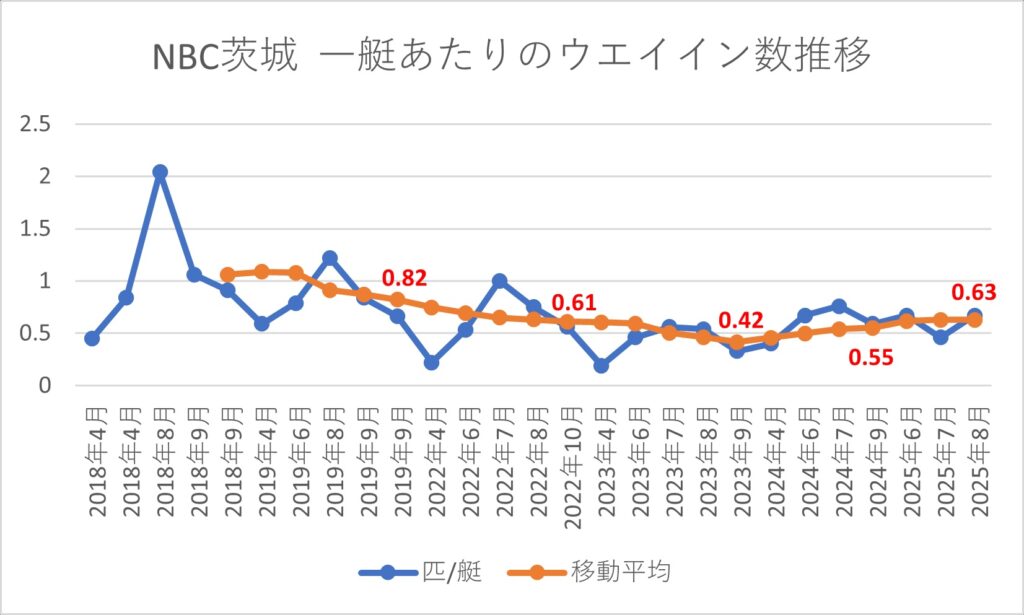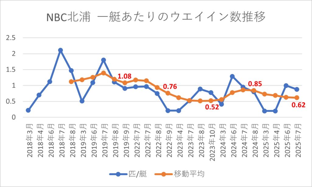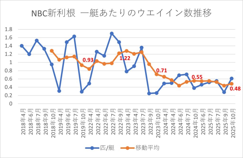 霞ヶ浦が主なトーナメントエリアであるWBS・JB霞・NBC茨城の指標は2023年で下げ止まって、わずかながら上昇傾向に入った感じに見えます。しかし、同じく霞ヶ浦がトーナメントエリアであるNBC霞は下降傾向。油断はできない状況だと思います。