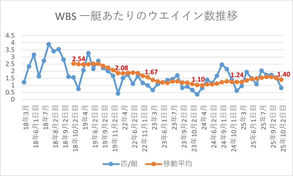 協議会が霞ヶ浦・北浦の状況を確認するための物差しとしているのがW.B.S.・JB・NBCなどの霞ヶ浦・北浦で行われた大会で『参加した選手(艇数)が何匹ウエイインできたのか』という数値の推移をグラフ化したものです。2024年の状況は以前のブログをご覧ください。